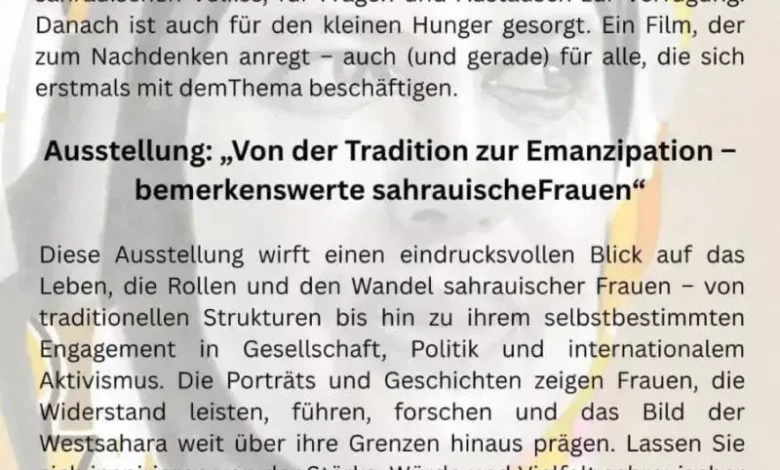 وفي السياق ذاته ، ستحتضن العاصمة برلين بدءًا من شهر أغسطس المقبل معرض صور بعنوان: “النساء الصحراويات بين الأصالة والحداثة في طريقهن إلى التحرر”، وسيُفتتح المعرض بأمسية ثقافية تتضمن عرض الفيلم الوثائقي “Insumisas” يعقبه نقاش مفتوح، ثم ختام بتقديم الشاي والأطباق الصحراوية التقليدية، في استمرارٍ للجهود الرامية إلى إبراز البعد الثقافي والإنساني لنضال المرأة الصحراوية.